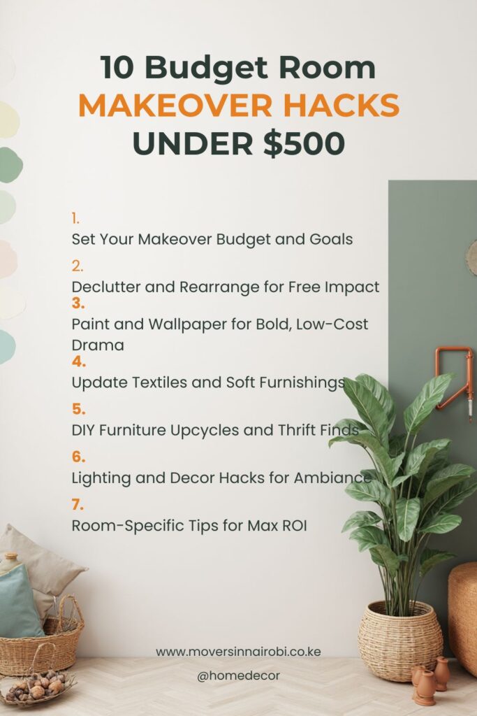 Start by assessing your room’s needs and capping spending at $200–$500 for high-impact changes. List priorities such as decluttering, color refresh, or lighting upgrades, then allocate funds: 40% to paint/textiles, 30% to decor, 20% to furniture tweaks, and 10% to tools.